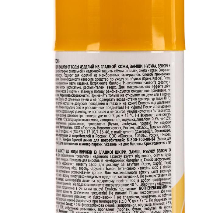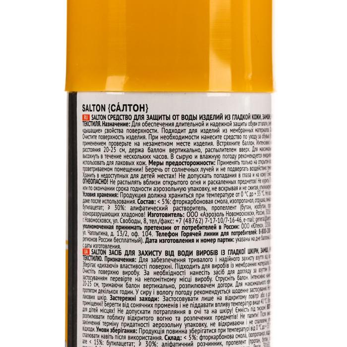 Средство для защиты от воды "Salton" в виде аэрозоля обеспечивает длительную защиту от влаги, снега и грязи, позволяя коже "дышать". Также подходит для изделий из замши, нубука и мембранных материалов. Не использовать для лаковых кож!