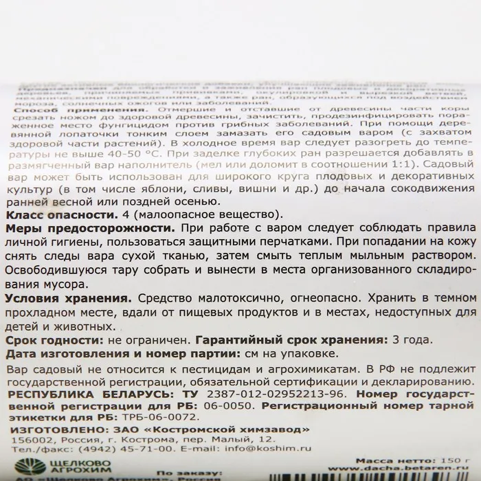 Садовый вар наносят на раны деревьев, чтобы защитить их от попадания патогенных микробов, грибков, паразитов и насекомых, а также от потерь древесного сока. Составом замазывают поврежденные участки не сразу, а спустя некоторое время, когда ранка слегка подсохнет. Ранки на стволах и ветках деревьев появляются по следующим причинам: