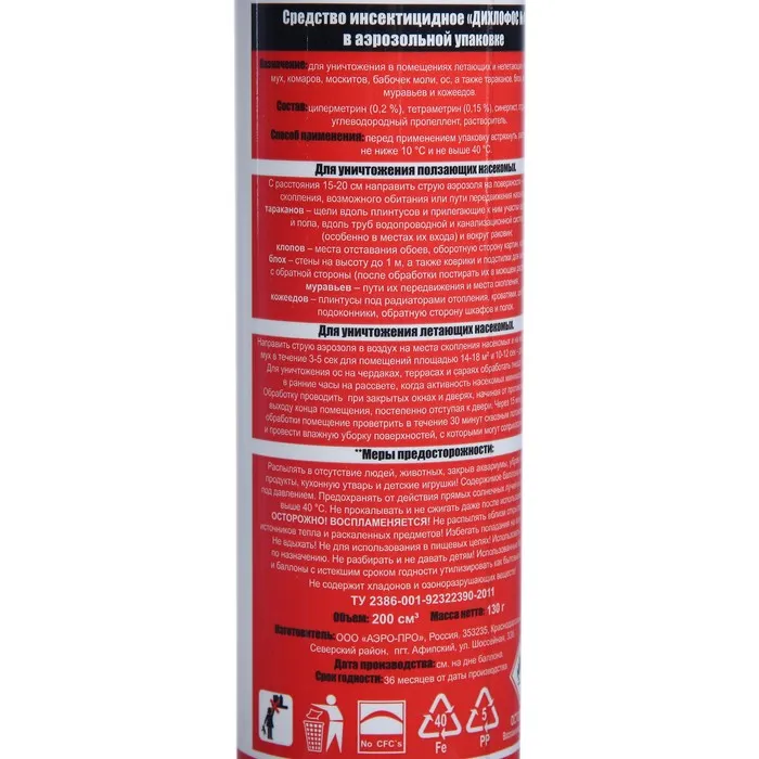 Способ применения: перед применением упаковку встряхнуть, распылять при температуре не ниже 10 ℃ и не выше 40 ℃