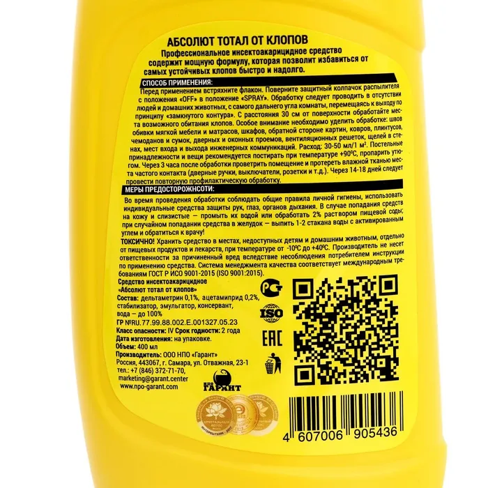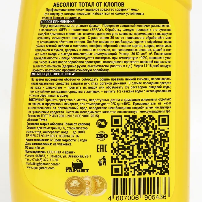 Средство инсектицидное от клопов "Абсолют Тотал", флакон с триггером, 400 мл — Характеристики