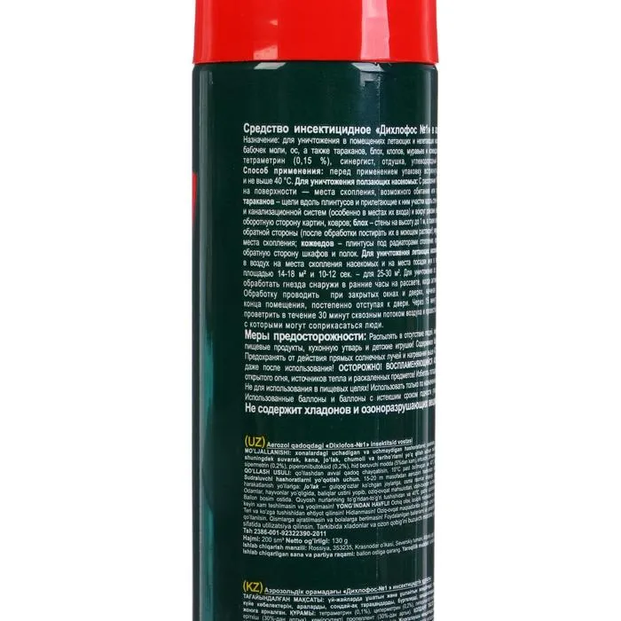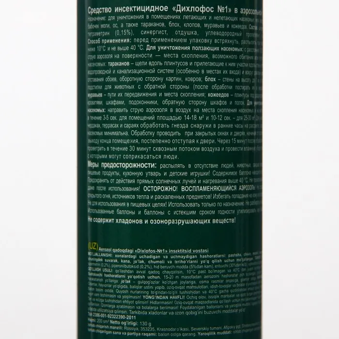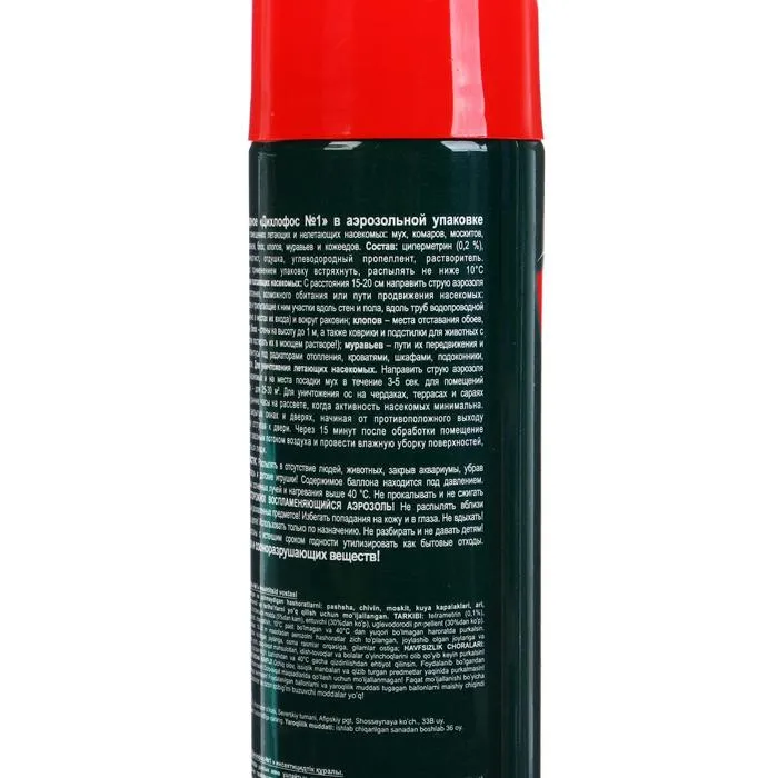 Инсектицидное "Дихлофос №1" в аэрозольной упаковке предназначено для уничтожения в помещениях летающих и нелетающих насекомых: мух, комаров, москитов, бабочек, моли, ос, а так же тараканов, блох, клопов, муравьев, и кожеедов.