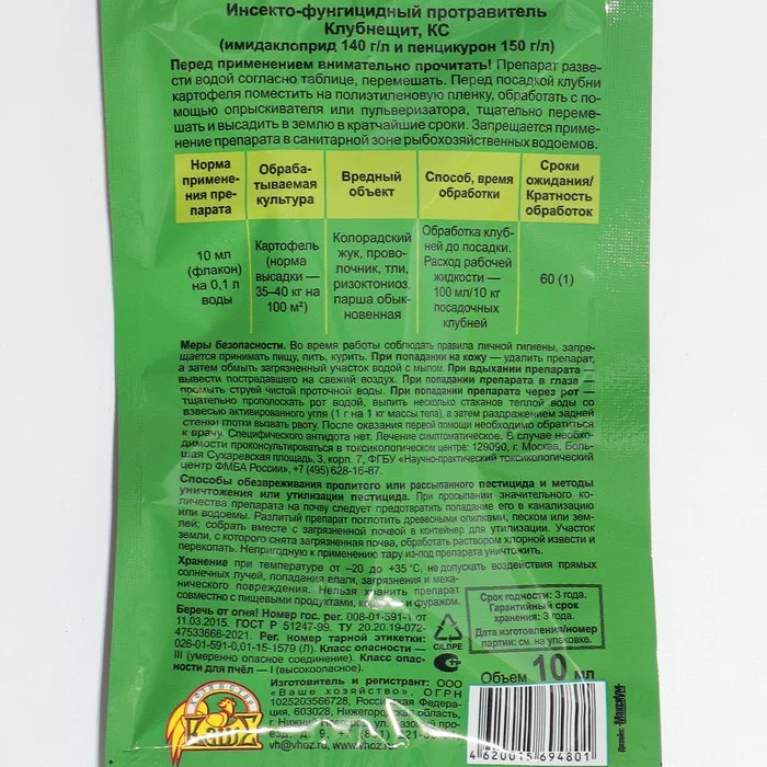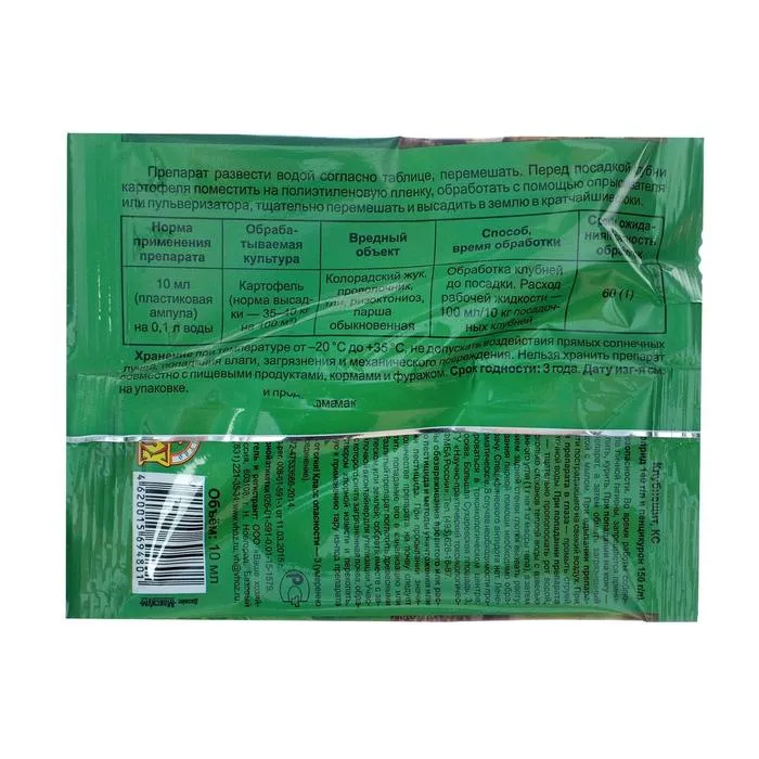 Удобен и экономичен в применении! Флакона 60 мл достаточно для обработки 60 кг клубней (примерно на 2 сотки). При таком способе применения отсутствует риск попадания препарата на растущие рядом культуры (овощные или зеленные грядки, ягодники, кустарники).
