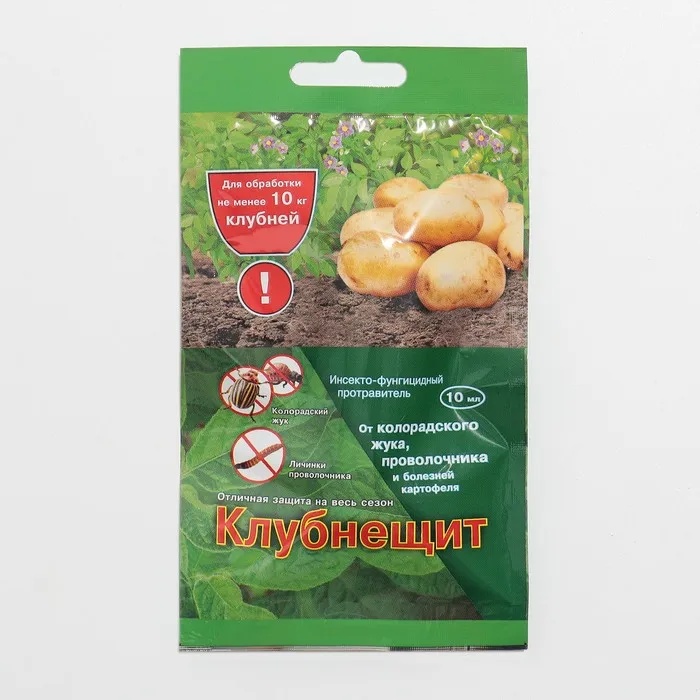 «Клубнещит»,для обработки клубней перед посадкой. Защищает картофель от проволочника, от колорадского жука и от комплекса болезней.