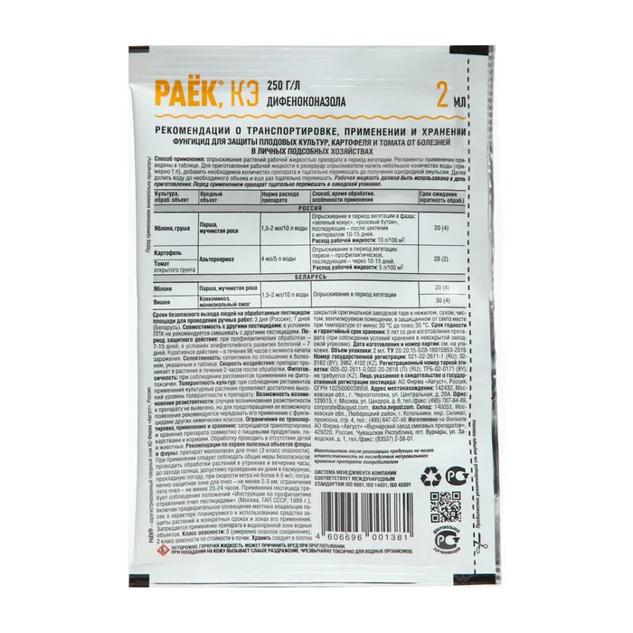 Средство от болезней на плодовых культурах "Август", "Раёк", ампула в пакете, 2 мл — Характеристики
