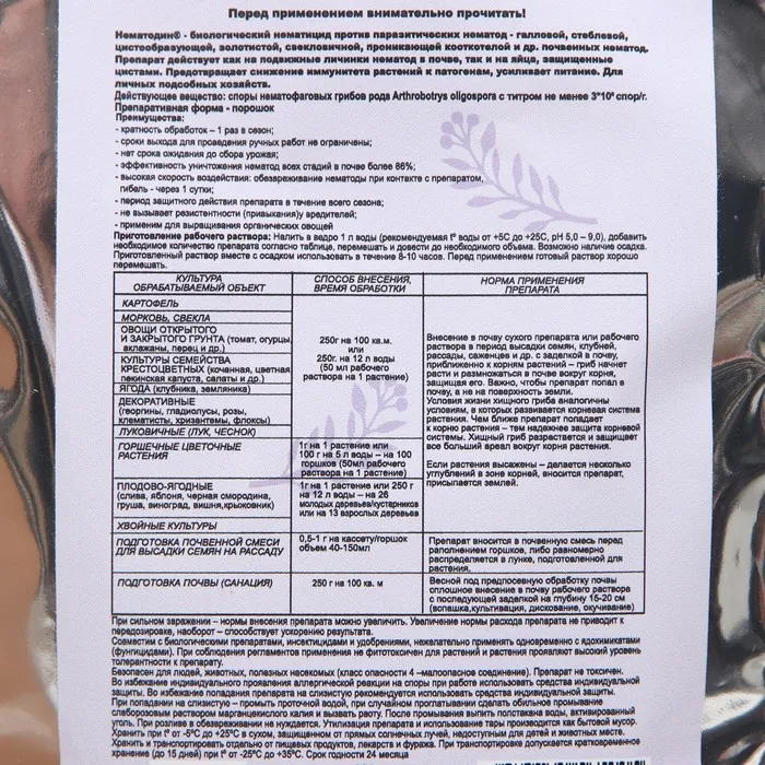 Препарат действует как на подвижные личинки нематод в почве, так и на яйца, защищенные цистами. Предотвращает снижение иммунитета растений к патогенам, усиливает питание. Для личных подсобных хозяйств.