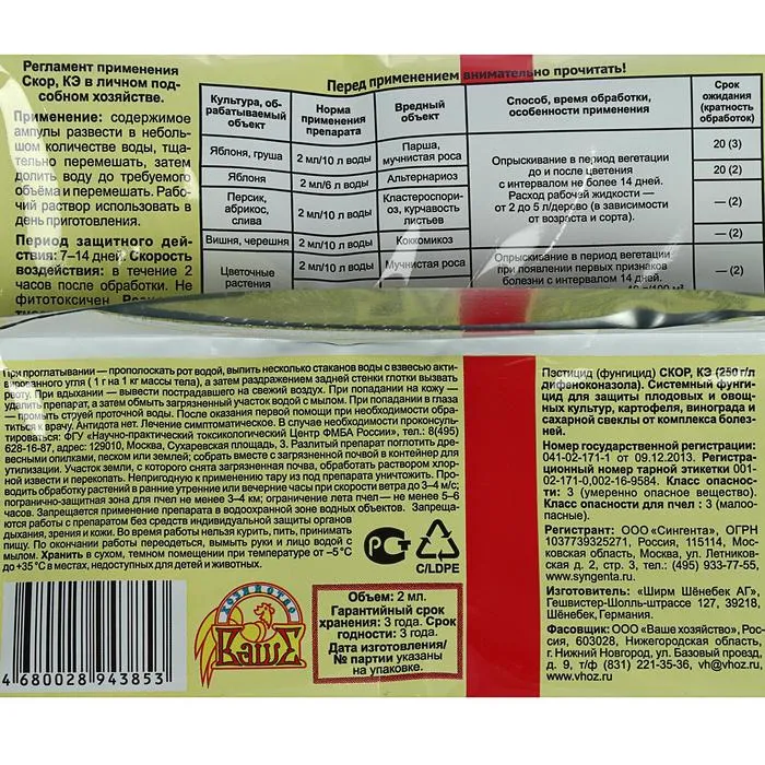 Средство от болезней растений "Скор" придёт на помощь в сложной ситуации. Средство безопасно для насаждений, но губительно для возбудителей болезней. Использование препарата на садовом участке будет лучшим проявлением заботы об огороде и существенно повысит ваши шансы сохранить плоды.