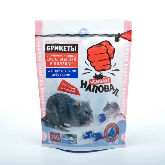Применение: брикеты раскладывают на подложки (б/у жестяные крышки, картонки) или в лотки по 1 шт. против мышей и по 1–2 шт. против крыс вблизи от нор, вдоль стен и перегородок через 2–4 метра.