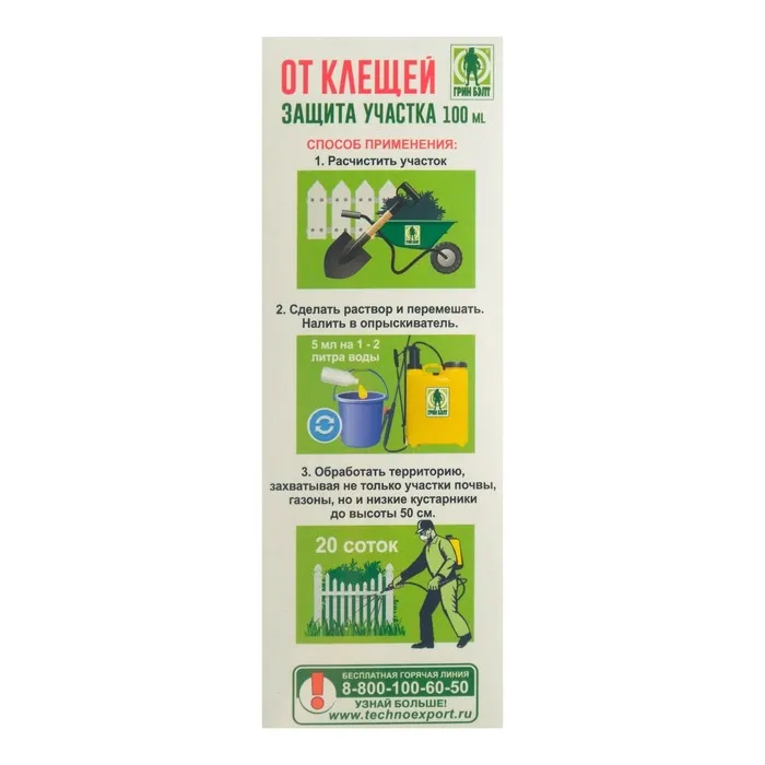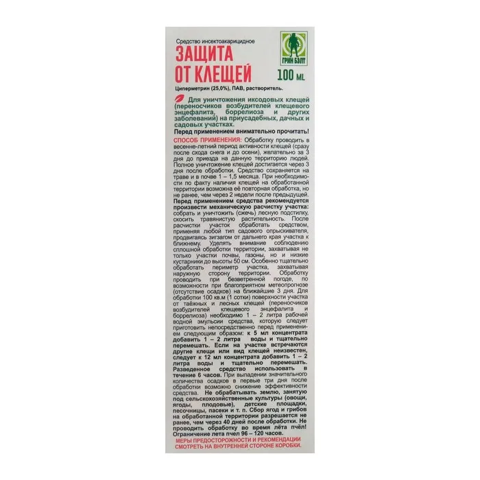 Способ применения: обработку проводить в весенне-летний период активности клещей (сразу после схода снега и до осени), желательно за 3 дня до приезда на данную территорию людей. Полное уничтожение клещей достигается через 3 дня после обработки. Средство сохраняется на траве и в почве 1 -1,5 месяца. При необходимости по факту наличия клещей на обработанной территории возможна её повторная обработка, но не ранее, чем через 2 недели после предыдущей.