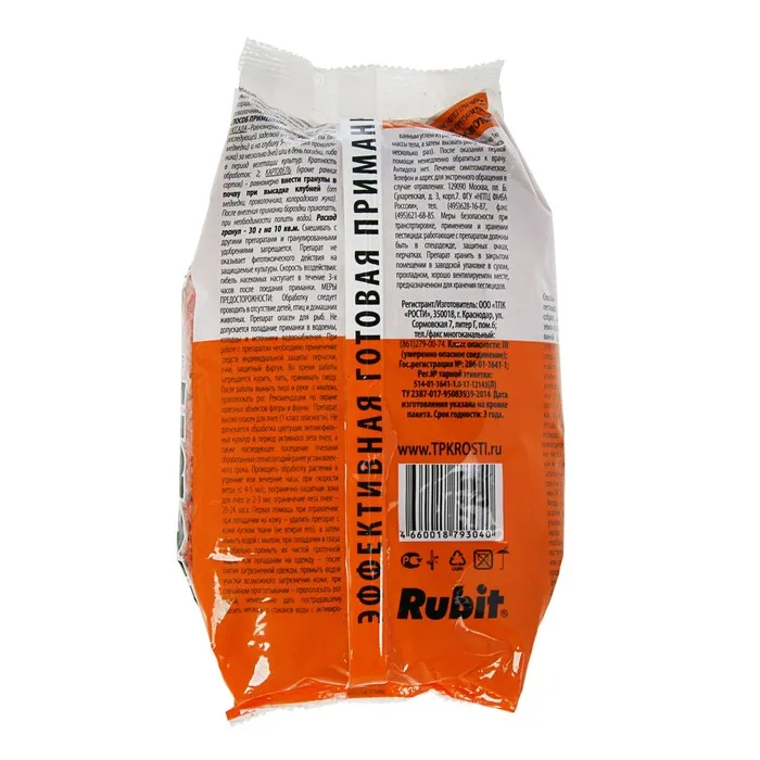 Рубит от медведки – химический препарат на основе современного инсектицида. Отличается высокой эффективностью, безопасностью для человека, животных. Выпускается в виде разноцветных гранул, готовых к применению. Эффект сохраняется 14 дней. Особенности препарата Средство от медведки Рубит изготавливается на основе крупы с добавлением активного отравляющего компонента, вспомогательных – для привлечения насекомых.