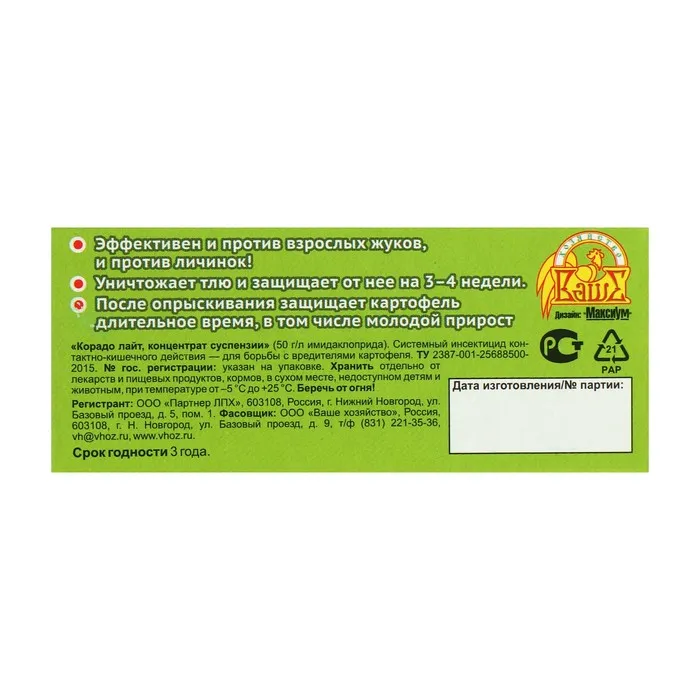 Корадо» гарантирует практически 100% гибель взрослых жуков и личинок всех возрастов, а также гибель вновь отрождающихся личинок и защищает картофель длительное время: в течение 3-4 недель после опрыскивания.