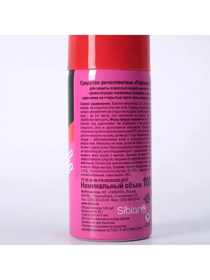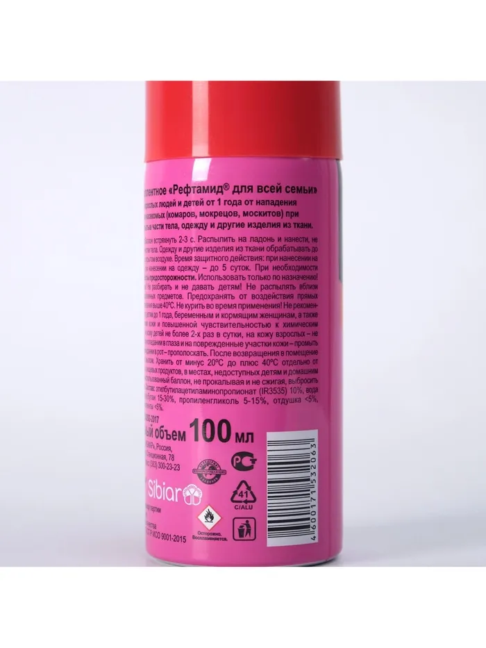 ОПИСАНИЕАэрозоль репеллент Рефтамид Baby, 100 мл На природе и дома многие люди сталкиваются с клещами, клопами, москитами и другими опасными насекомыми, которые способны причинить массу вреда. Они переносят инфекцию, пьют вашу кровь и просто раздражают своим внешним видом.; Средство репеллент от торговой марки «Рефтамид» применяется для защиты детей от укусов кровососущих насекомых (комаров, мокрецов, москитов). Состав препарата разработан с учётом особенностей чувствительной кожи ребёнка. Детям с трёхлетнего возраста средство наносится на одежду, с пятилетнего возраста — на открытые части тела.; Аэрозоль сохраняет своё действие в течение 2 часов.; Храните средство в недоступном для детей месте. Предохраняйте от попадания препарата на пластик.; Состав: альфациперметрин 0,2%, N,N-диэтилтолуамид (ДЭТА) 7,0%, спирт этиловый денатурированный 49,6%, вспомогательные компоненты, отдушка, углеводородный пропеллент. Срок годности: 5 лет.