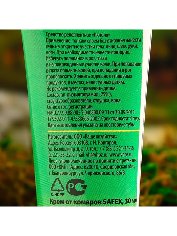 Крем от комаров SAFEX наноситься тонким слоем (без втирания) на открытые участки тела. Применение: тонким слоем без втирания нанести гель на открытые участки тела (лицо, шею, руки, ноги). При необходимости нанести повторно. Избегать попадания в рот, глаза и на поврежденные участки кожи. При попадании в глаза, промыть водой, при попадании в рот прополоскать.Хранить отдельно от пищевых продуктов, в местах, недоступных детям. Не рекомендуется применять детям.Состав: пп-диэтилтолуамид 25 %, структурообразователи, отдушка, вода.