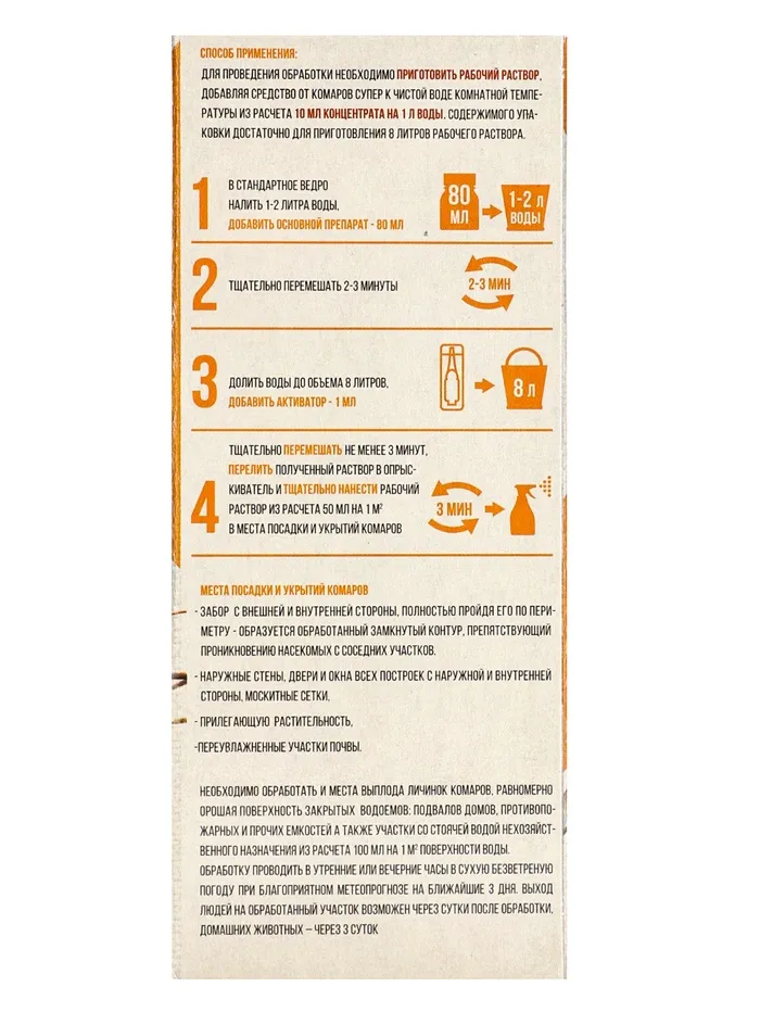 Как использовать: Распылите средство в местах скопления комаров — у окон, дверей, в беседках или на верандах. Для усиления эффекта можно обработать москитные сетки. «Супер» подходит для борьбы с комарами в доме, на даче или во время отдыха на природе. Держите флакон подальше от детей и избегайте попадания на продукты питания.
