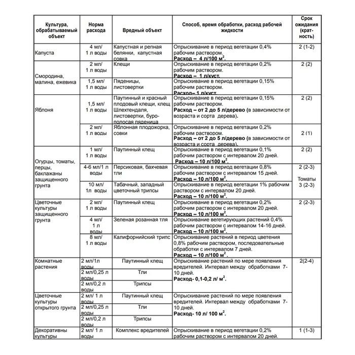 Действие препарата не зависит от погоды. Благодаря длительному защитному действию за весь летний сезон требуется только одна обработка. Состав проникает в листья и продвигается по растению системно, защищая даже те части, на которые не попал препарат.