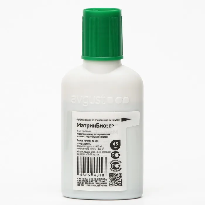 МатринБио - уникальный на российском рынке натуральный биопрепарат для защиты цветочных культур и комнатных растений от клещей и других вредителей. Высокоэффективен против клещей (войлочный клещ (зудень), паутинный клещ и другие), тепличной белокрылки, тли, трипсов, цикадок, совок, гроздевой листовёртки и прочих.