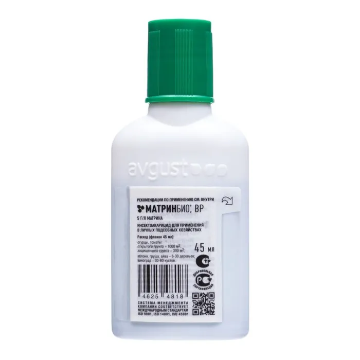 Состав препарата имеет растительное происхождение, благодаря чему безопасен для растений, человека и окружающей среды. Подходит для применения в квартире. Насекомые и клещи, после контакта с препаратом, снижают двигательную активность, перестают питаться и погибают за 3-5 дней. Матрин Био воздействует на разные стадии развития вредителей, уничтожает даже яйцекладки. Защитный эффект продлится не менее 14 дней.