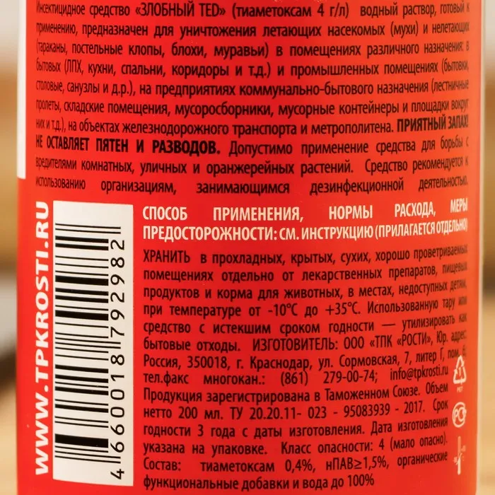 Средство «ЗЛОБНЫЙ TED» водный раствор, готовый к применению, предназначен для уничтожения летающих насекомых (летающих насекомые) и нелетающих (тараканы и др. домашних насекомых ) в помещениях различного назначения: в бытовых (ЛПХ, кухни, спальни, коридоры и т.д.) и промышленных помещениях (бытовки, столовые, санузлы и д.р.), на предприятиях коммунально-бытового назначения (лестничные пролеты, складские помещения, мусоросборники, мусорные контейнеры и площадки вокруг них и т.д.), на объектах железнодорожного транспорта и метрополитена.Допустимо применение средства для борьбы с вредителями комнатных и оранжерейных растений. Средство рекомендуется к использованию организациям, занимающимся дезинфекционной деятельностью.СПОСОБ ПРИМЕНЕНИЯ И НОРМЫ РАСХОДА: Перед использованием упаковку со средством необходимо встряхнуть. Перевести головку распылителя из нерабочего (OFF) в рабочее (SPRAY или STREAM) положение. Для обработки нажимать на курок распылителя, направляя его головку на обрабатываемую поверхность. За одно нажатие на курок из упаковки в среднем выходит: в режиме «SPRAY» – 0,5 мл, в режиме «STREAM» – 0,8 мл средства. Струей средства обрабатывают места скопления, обитания и проникновения в помещение насекомых, нажимая на распылительную головку с расстояния 30-50 см от обрабатываемой поверхности. По окончании работы со средством следует перевести головку распылителя в нерабочее положение (OFF).Составтиаметоксам 0,4%, нПАВ⩾1,5%, органические функциональные добавки и вода до 100%