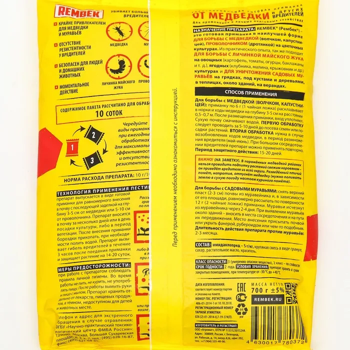 Рембек от медведки – высокоэффективное средство для защиты сельскохозяйственных культур от медведки и проволочника с особо привлекательным для вредителей вкусом и запахом. Обладает 100 % эффектом уничтожения насекомых, их яиц и личинок. Активным компонентом выступает борная кислота. Вещество не вредит человеку, в отличие от токсичных инсектицидных средств, у насекомых, при попадании внутрь вызывает паралич, смерть.