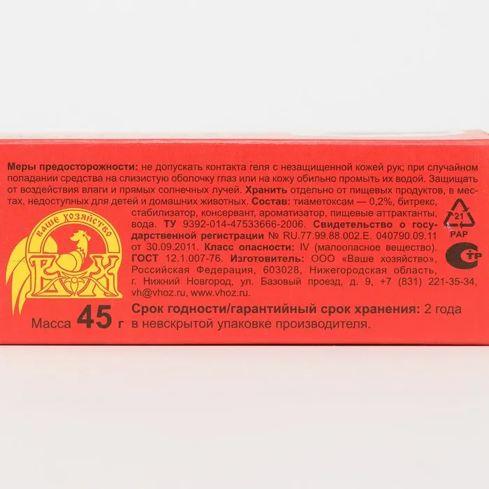 • Срок действия геля сохраняется 1-1,5 месяца. Повторное применение рекомендуется в случае залета мух в помещения.
