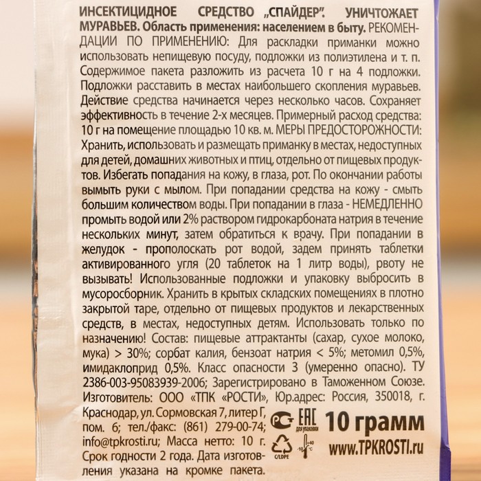 Известно, что муравьи, как и тараканы, являются механическими переносчиками множества инфекционных заболеваний, поэтому появление муравьиной колонии, например, на кухне является потенциально опасным для здоровья человека явлением. Механизм действия Zarit СПАЙДЕР основан на особенностях существования и питания муравьиных колоний и позволяет эффективно и в короткие сроки избавиться от нежелательного и небезопасного соседства.