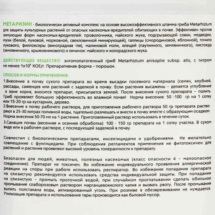 Метаризин — уникальный биологический инсектоакарицид на основе гриба Metarhizium от почвообитающих вредителей (медведки, проволочника, клеща, личинок майского жука и многих других. Действующее вещество: природные штаммы гриба Метаризиум (Metarhizium anisopliae).Способ воздействия: контактно-кишечный.Химический класс: энтомопатогенных грибов.Споры Metarhizium вызывают заболевания и гибель насекомых, тем самым снижают популяцию вредителей:почвообитающих насекомых ( проволочников; медведок; майских жуков (хрущей) и их личинок; подгрызающих совок и др)зимующих или проходящих одну из стадий своего развития в почве или на поверхности почвы: клещей (паутинного, земляничного и др.); листоеда (земляничного, крыжовникового); колорадского жука; долгоносика; огневки; пилильщика; клопа крестоцветного; мухи (морковной, луковой, капустной); крымского и турецкого скосаря; галлицы (смородиновой, яблонной) и множества других насекомых – вредителей).Инструкция по применению:Внесение в почву в сухом виде:50-100г на сотку / 15-20г на кустарник, дерево;Пролив почвы: 50г на 30-50л поливной воды;Санация почвы (весенняя и осенняя обработка): 100-150г на сотку.