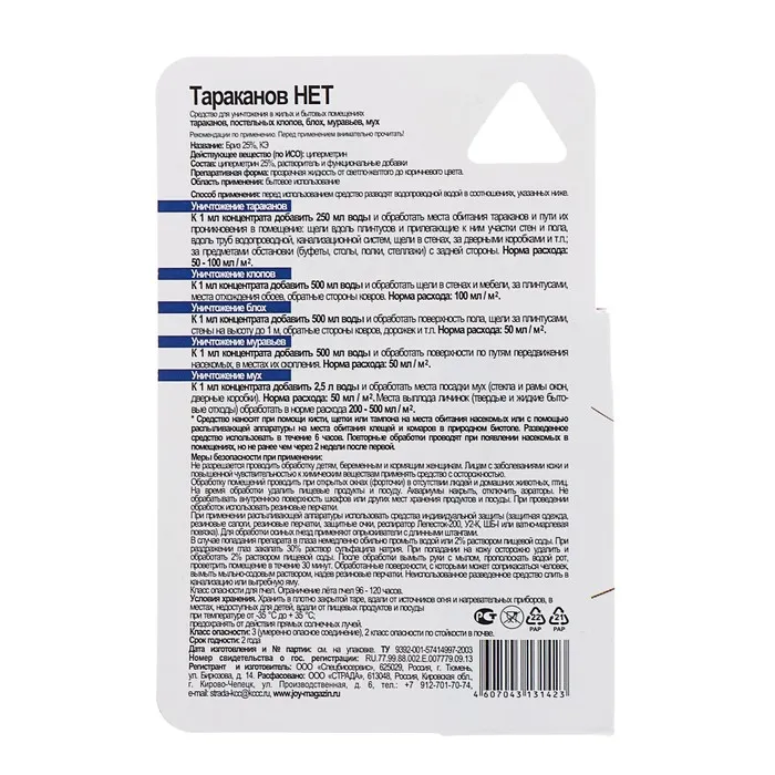Эффективное средство предназначено для борьбы с домашними насекомыми-вредителями: тараканами, муравьями, клопами, блохами. Оказывает воздействие не только на взрослых особей, но так же и на личинок вредителей. Полное уничтожение через 3 дня.