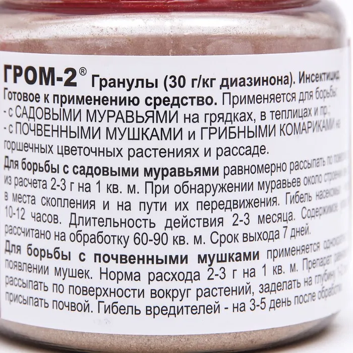 Средство от муравьев «Гром-2» — химический инсектицид, предназначенный для истребления муравьев, почвенных мошек, грибных комаров в горшках комнатных растений и на приусадебном участке. Для достижения результатов необходимо внести препарат в толщу почвы на глубину 1–2 см по пути следования муравьев или в местах скопления насекомых. Муравьи гибнут спустя 3–5 дней после контакта с действующим веществом препарата. Защитное действие сохраняется 2–3 месяца, достаточно купить препарат 1–2 раза на сезон. Упаковки в 10 г хватает для обработки 8–10 м2 почвы.