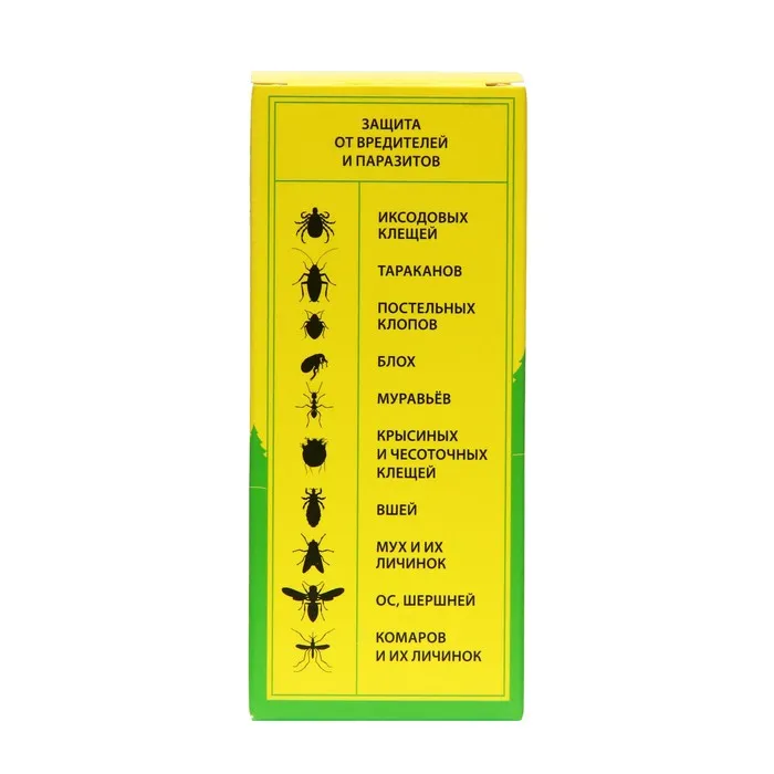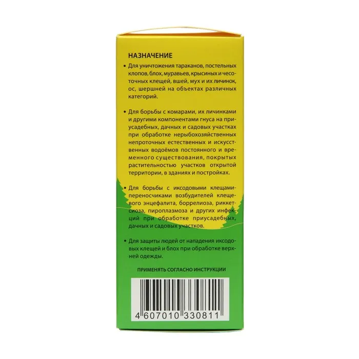 Концентрат, предназначен для применения в практике медицинской дезинсекции — с целью уничтожения синантропных членистоногих (тараканов, постельных клопов, блох, муравьев, крысиных клещей, мух, ос) на объектах различных категорий: в жилых, нежилых, производственных, хозяйственных и подвальных помещениях, на объектах коммунально-бытового назначения (гостиницы, общежития, спорткомплексы), на предприятиях пищевой промышленности, общественного питания, магазинах, в детских и лечебно-профилактических (ЛПУ) учреждениях (кроме спален и игровых комнат); дезинсекции помещений в ЛПУ и очагах чесотки и педикулеза против чесоточных клещей и вшей; для обработки отходов классов А, Б и В в ЛПУ для уничтожения синантропных насекомых (тараканы, блохи, муравьи, вши, личинки и имаго мух, комары, осы), крысиных и чесоточных клещей; дезинсекции на объектах железнодорожного транспорта и метрополитена, включая вагоны различного типа, вагоны служебные и специального назначения, вагоны-рестораны и буфеты, стационарные объекты ведомственного подчинения в отсутствие людей; борьбы с комарами и их личинками в закрытых городских водоемах, в зданиях и постройках; борьбы с комарами и другими компонентами гнуса в природных стациях — при обработке нерыбохозяйственных непроточных естественных и искусственных водоемов постоянного и временного существования, покрытых растительностью участков открытой территории, в зданиях и постройках (категорически запрещено применение средства в водоемах, имеющих хозяйственное значение и используемых для разведения рыбы, птицы); борьбы с иксодовыми клещами (переносчиками возбудителей клещевого энцефалита (КЭ), клещевого боррелиоза (болезнь Лайма) и других заболеваний) при обработке природных стаций; для защиты людей от нападения иксодовых клещей и блох (переносчиков возбудителей опасных заболеваний человека) при обработке верхней одежды.Действующее вещество: циперметрин 25%