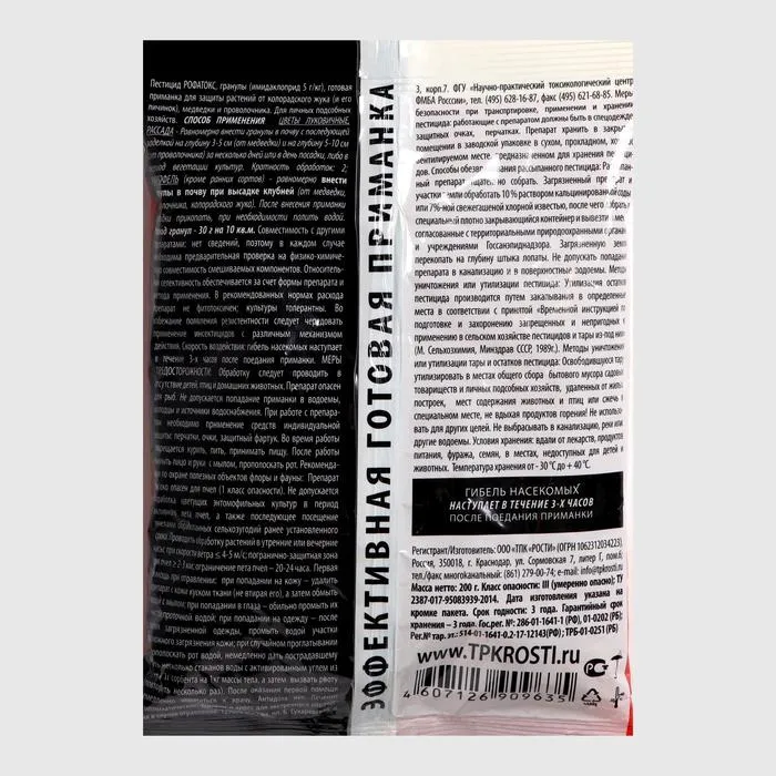 Меры Предосторожности: обработку следует проводить в отсутствие детей, птиц и домашних животных. Препарат опасен для рыб. Не допускается попадание приманки в водоемы, колодцы и источники водоснабжения.
