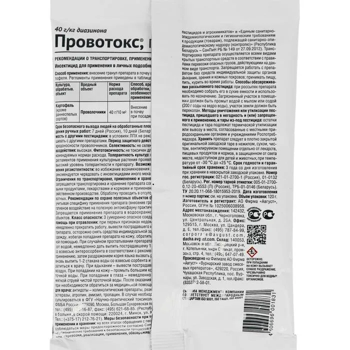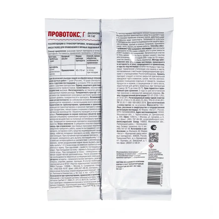 Способ применения: препарат раскладывается в лунки (на расстоянии 3-5 см от клубней) во время высадки картофеля. Раскладку препарата осуществлять утром (до 10:00) или вечером (после 18:00) в безветренную погоду при температуре не более 25ºС.