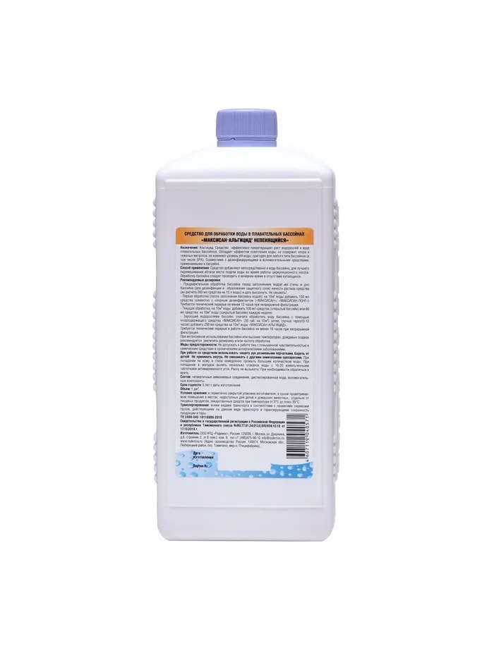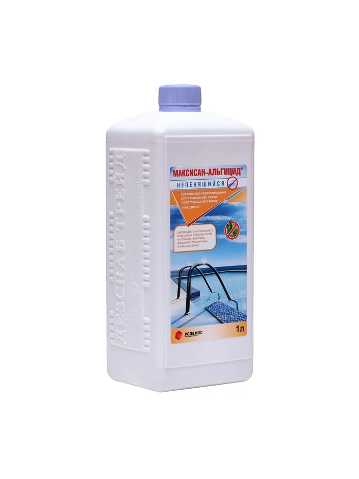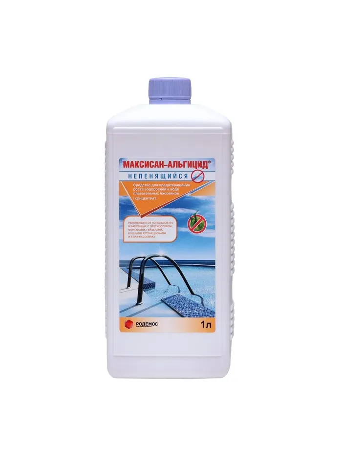 Назначение: средство предназначено для предотвращения размножения водорослей в воде плавательных бассейнах. Альгицид обладает эффектом осветления воды; не содержит хлора и тяжелых металлов; не изменяет уровень рН воды; пригоден для любого типа бассейнов (в том числе SPA). Совместимо с дезинфицирующими и вспомогательными средствами, применяемыми в бассейне.