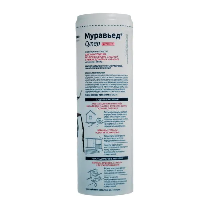 Муравьед – инсектицид контактно-кишечного действия против муравьёв. Попадая с пищей в организм муравьёв, он воздействует на нервную систему насекомых, вызывает паралич и уже в течение первых трёх суток после обработки неминуемо приводит к их гибели.