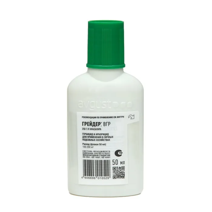 Грейдер - системный гербицид сплошного действия для уничтожения всех видов нежелательной травянистой и древесной растительности. Применяется на землях несельскохозяйственного назначения.Препараты от сорной растительности обладают ограниченным сроком действия. Такие свойства вполне оправданы и необходимы для того, чтобы после очистки территорий была возможность что-то на них посадить. Но бывают ситуации, когда нужно освободить участок под постройку дома или, например, избавиться от сорняков на погосте на длительное время. Здесь на помощь и приходит Грейдер. Он уничтожает все виды нежелательной травянистой и древесно-кустарниковой растительности, ему подвластны даже злостные и карантинные сорняки, в том числе амброзия полыннолистная. Также Грейдер легко справляется с лиственной и хвойной порослью, например, осиной, березой, ольхой, ивой, сосной, елью и др. Препарат обладает высокой почвенной активностью и уничтожает не только существующие сорняки, но и новые всходы на срок до 3-х лет (в зависимости от нормы расхода, количества сорняков, типа почвы и др.). Уже через час после обработки гербицид не смывается дождем, результативен при широком диапазоне температур. Несмотря на то, что Грейдер малотоксичен для млекопитающих, птиц и пчел, подходить к его применению нужно со всей ответственностью, дабы не уничтожить полезные культуры. Не проводите обработку ближе нескольких метров к таким растениям, препарат имеет умеренную миграцию в почве, поэтому способен негативно повлиять на их развитие. При использовании препарата важно четко следовать инструкции и не превышать допустимых норм. Тогда Грейдер станет незаменимым помощником для борьбы с сорняками на непосевных территориях.В течение первых суток после обработки прекращается рост и развитие растений. Видимые признаки повреждений проявляются через 7-14 дней в виде обесцвечивания и побурения точек роста. Полная гибель травянистой растительности наступает через 1-2 месяца, древесно-кустарниковой – через 2-3 месяца. Мощное средство длительного действия против любой растительности.Полное уничтожение всех видов сорняков даже самых злостных и нежелательной древесно-кустарниковой растительности.Защищает на срок до 3 лет.Действует на надземную часть сорняков и их корневую систему.Устойчив к смыванию дождём уже через час после обработки. Действующее вещество: 250 г/л имазапира.Препаративная форма: ВГР - водно-гликолевый раствор.Производитель: АО Фирма «Август», Россия.Фасовка: 10 мл, 50 мл, 100 мл, 500 мл (флакон).Срок годности: 4 года.