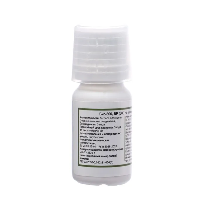 БИС-300 - уникальный гербицид для борьбы с однолетними и многолетними сорняками на газоне и посадках земляники в период вегетации.Обладает избирательным действием, подавляя только сорную растительность. Полностью уничтожает не только наземную, но и корневую систему сорняков.БИС-300 отличается исключительно высокой эффективностью в борьбе с осотом, ромашкой, горцами, одуванчиками, подорожником и пр., уничтожает сорняки на всех стадиях развития.Хорошо проникает в листья сорных растений и быстро передвигается в корневища, прекращая рост, и вызывая отмирание как надземной, так и подземной части сорняка.Идеален для поддержания в чистоте взрослых газонов. Период защитного действия: Оказывает гербицидное действие на чувствительные сорные растения в течении всего сезона. Гербицид избирателен к растениям сахарной свеклы, рапса ярового и озимого, льна-долгунца, кукурузы, газонным злаковым травам. Скорость воздействия: подавление роста сорняков происходит в течение нескольких часов после проведения обработки. Первые видимые симптомы действия препарата становятся заметны через 4-6 часов. Не фитотоксичен. Безопасность: Участок земли, с которого снята загрязненная почва, обрабатывают 3-5%-ным раствором кальцинированной соды и перекапывают. Загрязненную почву и пролитый препарат в контейнерах обрабатывают раствором хлорной извести и промывают водой. Обезвреживание отходов пестицида проводить путем обработки их 5 %-ным раствором щелочи или 7-10 %-ным раствором натриевой соли с последующим термическим обезвреживанием. Освободившуюся тapy промывают водой, обрабатывают раствором, ополаскивают водой, приводят в непригодное для повторного использования.Хранение при температуре от 0 °С до плюс 30 °С. Не допускается хранение препарата совместно с пищевыми продуктами, вдали от воздействия прямых солнечных лучей, попадания влаги, загрязнения и механического повреждения. Не допускается совместное транспортирование и хранение препарата с кормами и пищевыми продуктами.
