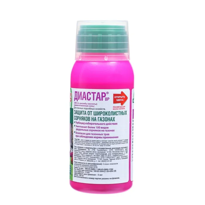 Эффективное средство избирательного действия для защиты газона от злостных сорняков. Диастар - это удобное, быстрое и эффективное средство для улучшения внешнего вида вашего газона. Только идеальная газонная трава без лишних сорняков. Для защиты газона от зарастания одуванчиками, конским щавелем, лопухами, подорожником и другими широколистными сорняками. Основное применение - газон. Но сорняки досаждают, захватывая свободные участки вдоль забора, теплицы, хозблока. Прополол отлично справится и там. Развести 20 мл препарата в 3 литрах воды. Опрыскивать сорняки равномерно смачивая листья. Одна обработка действует в течение месяца. Действует в течение 2-3 часов после опрыскивания. Полностью сорняки отмирают за 1-2 недели, в зависимости от вида растения.