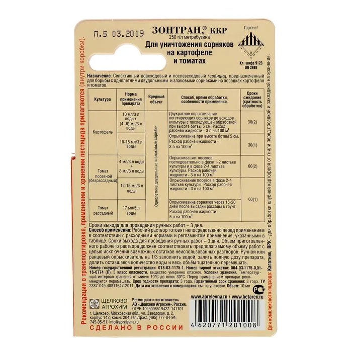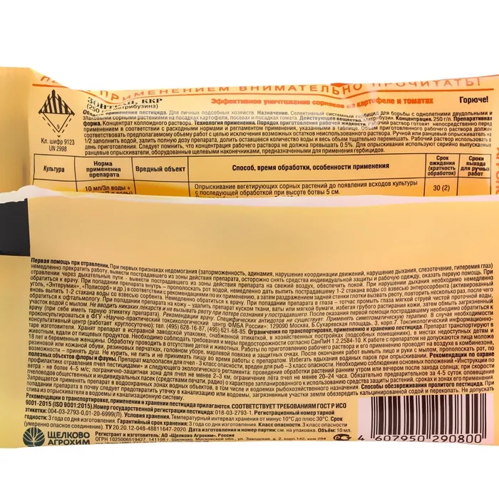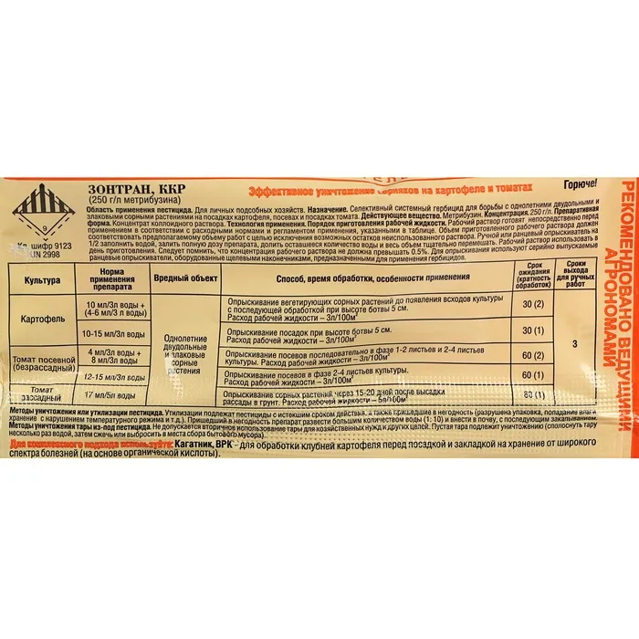 Системный гербицид в инновационной формуляции для борьбы с широким спектром двудольных и злаковых сорняков на картофеле, томатах, пшеницы озимой, сои, нута.