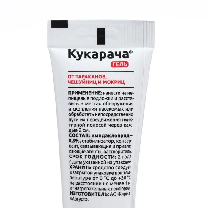 Способ применения: гель наносят на непищевые подложки и расставляют в местах обнаружения или скопления насекомых на пути их передвижения пунктирной полосой: 2 см геля - 2 см необработанной поверхности.