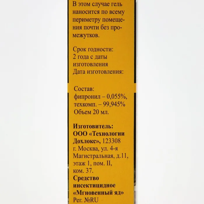 Позволяет очень быстро избавиться от тараканов благодаря уникальному химическому составу, содержащему сверхсильный инсектицид в повышенных концентрациях. Результат виден уже в первые 24 часа после применения. Основная масса насекомых погибает на 2-е — 3-и сутки, а полностью они исчезают из помещений за 5‒7 дней.Инструкция по применению: Аккуратно выдавливать гель, распределяя его небольшими полосками по периметру помещения: вдоль плинтусов, стен, щелей. Особое внимание уделить обработке вентиляционных отверстий. Нанести побольше средства на пол под мойками, батареями отопления, кухонными шкафами и в санузлах.Меры предосторожности: Хранить в сухом, прохладном, затемнённом помещении, недоступном для детей и домашних животных, вдали от пищевых продуктов. После работы со средством вымыть руки с мылом. При попадании в глаза или на кожу смыть большим количеством воды.Состав: фипронил (0,055 %), техкомпоненты (99,945 %).