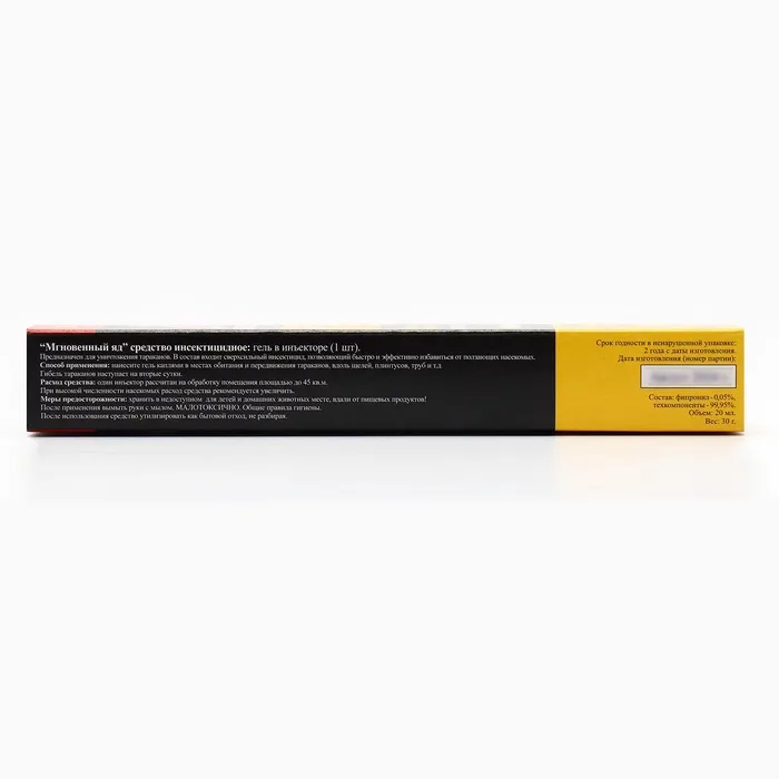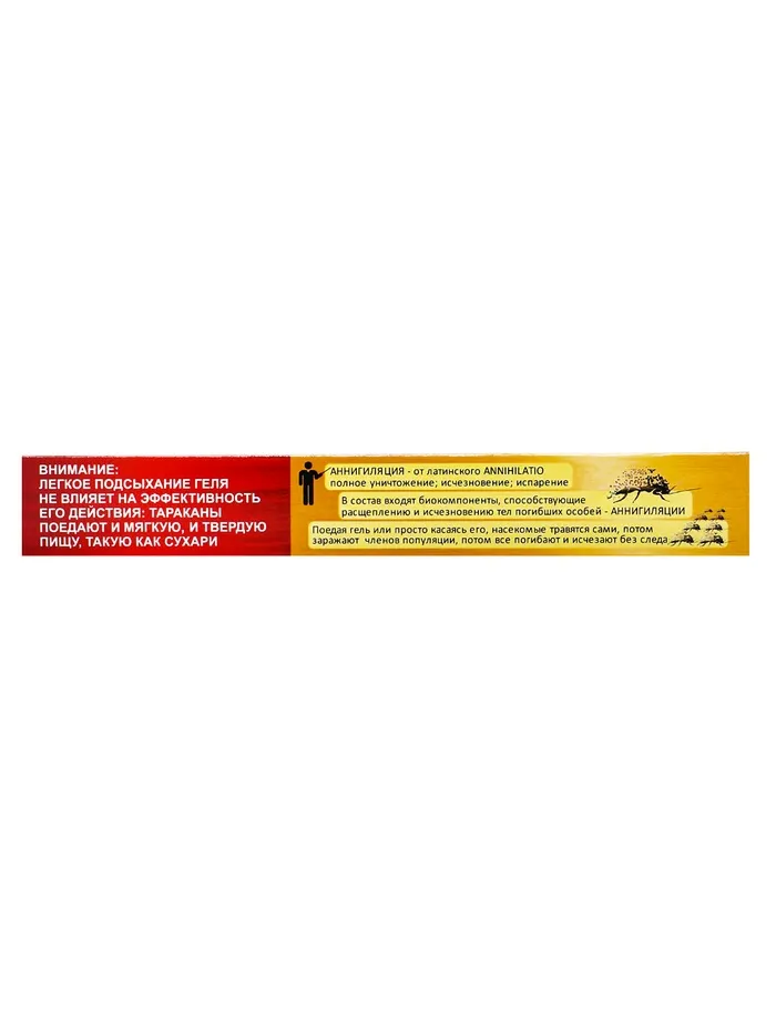 Позволяет очень быстро избавиться от тараканов благодаря уникальному химическому составу, содержащему сверхсильный инсектицид в повышенных концентрациях. Результат виден уже в первые 24 часа после применения. Основная масса насекомых погибает на 2-е— 3-и сутки, а полностью они исчезают из помещений за 5‒7 дней.Инструкция по применению: Аккуратно выдавливать гель, распределяя его небольшими полосками по периметру помещения: вдоль плинтусов, стен, щелей. Особое внимание уделить обработке вентиляционных отверстий. Нанести побольше средства на пол под мойками, батареями отопления, кухонными шкафами и в санузлах.Меры предосторожности: Хранить в сухом, прохладном, затемнённом помещении, недоступном для детей и домашних животных, вдали от пищевых продуктов. После работы со средством вымыть руки с мылом. При попадании в глаза или на кожу смыть большим количеством воды.Состав: диазинон (0,55 %), техкомпоненты (99,45 %).
