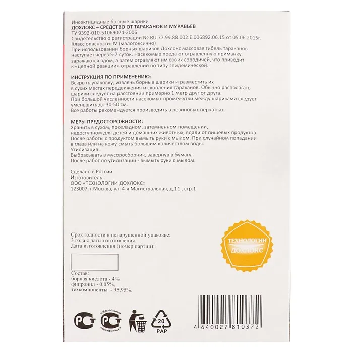 Средство от тараканов Дохлокс "Сгинь №56" Борные шарики, 8 шт. — Характеристики