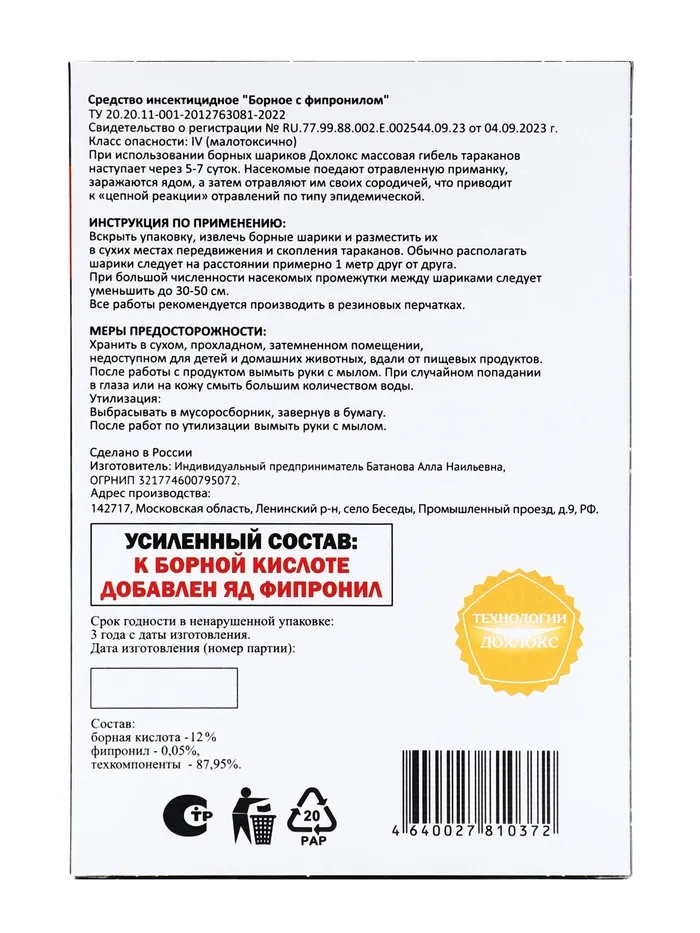 ОписаниеБОРНЫЕ ШАРИКИ «СГИНЬ!». Усиленные №56 для уничтожения массовых скопищ тараканов в квартирах ( 8 штук в упаковке) это самое известное народное средство от тараканов. В его состав входит настоящая борная кислота и фирменная пищевая приманка с ядом Дохлокс №56. Так что теперь это старое испытанное средство по уничтожению тараканов стало еще более эффективным и безотказным.Шарики следует вынуть из упаковки и разместить в местах появления и передвижения тараканов. Обычно располагать шарики следует на расстоянии примерно 1 метр друг от друга. При большой численности насекомых промежутки между шариками следует уменьшить до 30-50 см. Желательно не помещать в пыльные места. Не допускать контакта с маленькими детьми и домашними животными. После работы вымыть руки с мылом.СоставБорная кислота - 12%, фипронил - 0,05%, техкомпоненты - 87,95%.