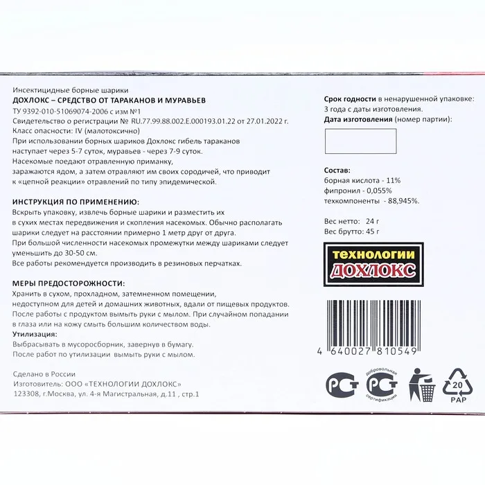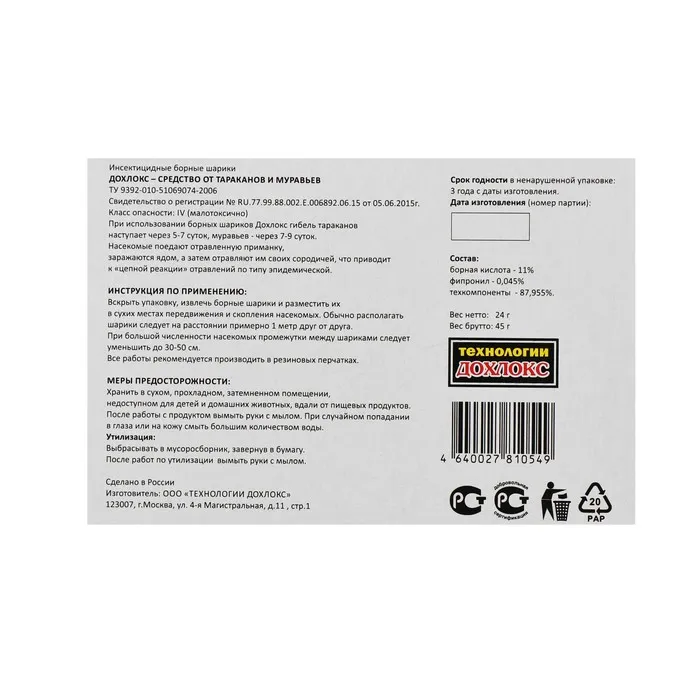 Борные шарики мгновенного действия от тараканов и муравьев Дохлокс, 8 штПри использовании борных шариков «Дохлокс» массовая гибель тараканов наступает через 5‒7 суток. Насекомые поедают приманку, заражаются ядом, а затем отравляют им своих сородичей, что приводит к цепной реакции по типу эпидемической.Инструкция по применениюВскрыть упаковку, извлечь борные шарики и разместить их в сухих точках скопления и передвижения тараканов. Располагать их следует на расстоянии примерно 1 м друг от друга. При большой численности насекомых промежутки следует уменьшить до 30‒50 см. Все работы рекомендуется производить в резиновых перчатках.Состав: