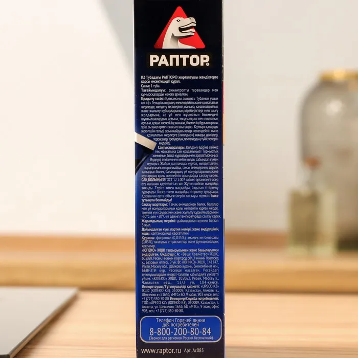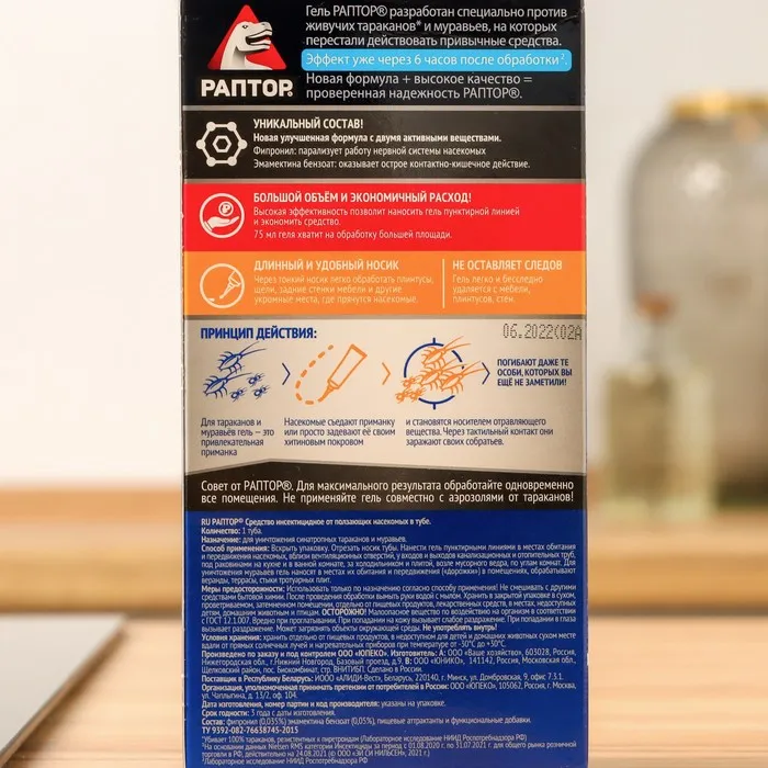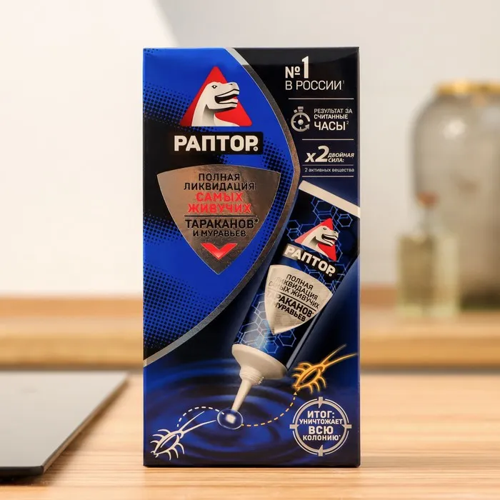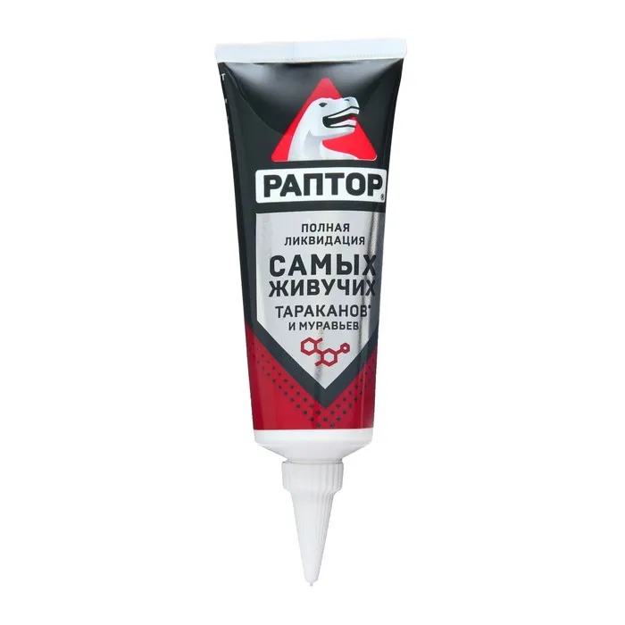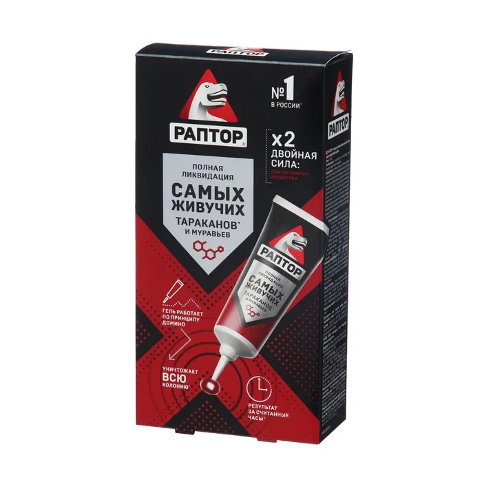 РАПТОР избавит вас от нежелательных соседей, наводнивших вашу квартиру, а заодно и от чувства неловкости перед гостями, заметившими, что они не единственные гости в вашем доме...Нанесите гель пунктирной или сплошной линией в местах массового обитания и передвижения насекомых. Он не имеет запаха, не растекается и не оставляет следов на поверхности. Удобный удлинённый носик тубы позволит вам добраться до самых труднодоступных укрытий - за плинтусами, под неплотно прилегающими к стене обоями, в трещинах и зазорах в напольных покрытиях.В состав средства входит два современных действующих вещества широкого спектра, работающих по "принципу домино”: через 24 часа после первого контакта насекомого с гелем начинается массовое вымирание всей популяции. Благодаря своей уникальной консистенции гель долго не высыхает, обеспечивая надёжную защиту от насекомых в течение 6 месяцев! ВАЖНО! Не рекомендуется одновременное использование аэрозоля и гелевого средства от тараканов и муравьёв, поскольку аэрозоль отпугивает насекомых от геля. Раптор-эффект: насекомых нет!Секрет популярности геля РАПТОР от тараканов и муравьев: Профессиональное уничтожение насекомых Действует по «принципу домино» - уничтожается вся популяция. Удобная туба с удлиненным носиком-аппликатором. Не оставляет следов на поверхности после высыхания. До 6 месяцев эффективного действия.В комплект входит Гель Раптор от тараканов и муравьев 75 мл х 2 шт.Составлямбда-цигалотрин - 0,1%; стабилизатор, консервант, гелеобразователь, битрекс, вода и пищевые атрактанты