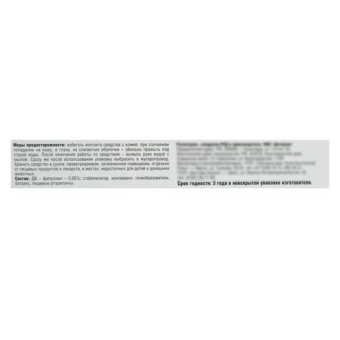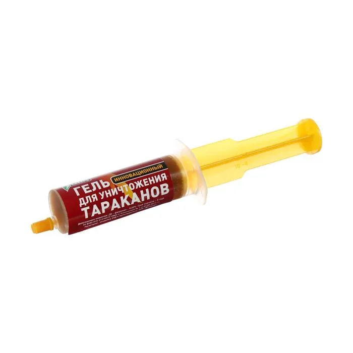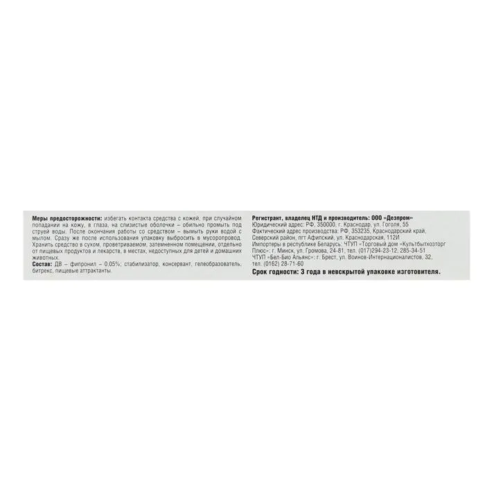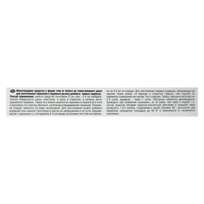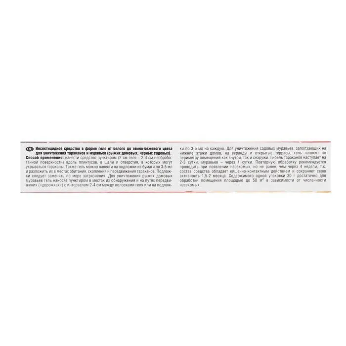Универсальное отечественное средство в борьбе с насекомыми, в том числе тараканами. Специальная зарекомендовавшая формула, действует очень эффективно. Предотвращает повторное появление насекомых.Способ применения: нанести средство пунктиром (2 см геля- 2-4 см необработанной поверхности) вдоль плинтусов, в щели и отверстия, в которых могут укрываться тараканы. Также гель можно нанести на подложки из бумаги по 3-5 мл и разложить их в местах обитания, скопления и передвижения тараканов. Подложки следует заменять по мере загрязнения. Для уничтожения рыжих домовых муравьев гель наносят пунктиром в местах их обнаружения и на путях передвижения с интервалом 2-4 см между полоскам геля или на подложки по 3-5 мл на каждую. Для уничтожения садовых муравьев, заполняющих на нижние этажи домов, на веранды и открытые террасы, гель наносят по периметру помещений как внутри, так и снаружи. Гибель тараканов наступает на 2-3 сутки, муравьев - через 1 сутки. Повторную обработку рекомендуется проводить при появлении насекомых, но не ранее, чем через 4 недели, т.к состав средства обладает кишечно-контактным действием и сохраняет свою активность 1,5-2 месяца. Состав: Действующее вещество (ДВ) - фипронил - 0,05%; стабилизатор; консервант; гелеобразователь; битрекс; пищевые аттрактанты.