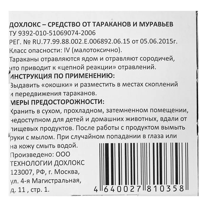 ОписаниеПри использовании средства тараканы отравляются ядом и заражают сородичей. Начинается цепная реакция по типу эпидемической, которая в скором времени приводит к массовой гибели популяции. Инструкция по применению: Выдавить «окошки» и разместить приманку в точках скопления и передвижения тараканов.Меры предосторожности: Хранить в сухом, прохладном, затемнённом помещении, недоступном для детей и домашних животных, вдали от пищевых продуктов. После работы со средством вымыть руки с мылом. При попадании в глаза или на кожу смыть большим количеством воды.Составфипронил - 0,055% ; техкомпоненты - 94,45%