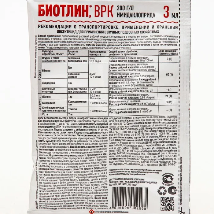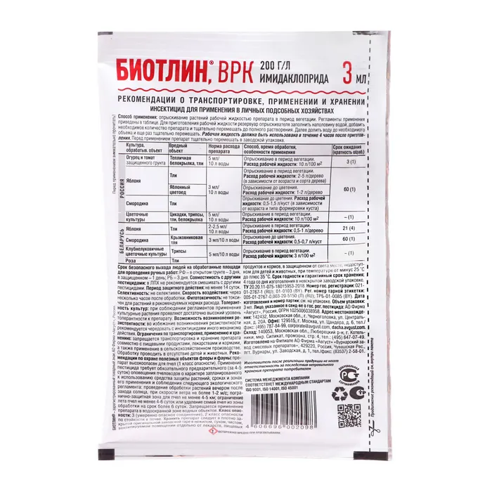Средство от тли на всех культурах Биотлин ампула в пак. 3 мл — Характеристики