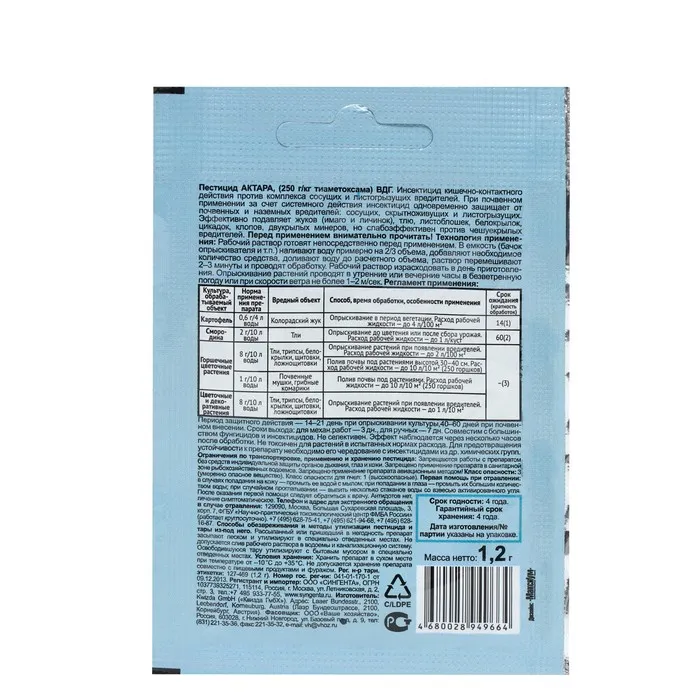 При почвенном применении за счет системного действия инсектицид одновременно защищает от почвенных и наземных вредителей: сосущих, скрытноживущих и листогрызущих. Состав: 250 г/кг тиаметоксама ВДГ (воднодиспергируемые гранулы).