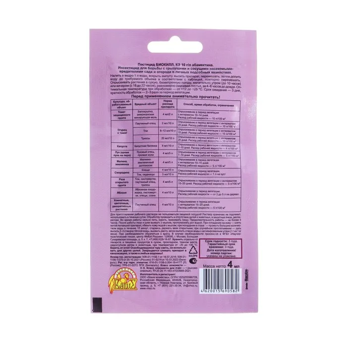 «БИОКИЛЛ» имеет широкий спектр действия: против более 20 видов насекомых вредителей, в том числе колорадского жука, капусной белянки, капусной совки, паутинного клеща, яблонной плодожорки, цветоедов, трипсов, всех видов тли.