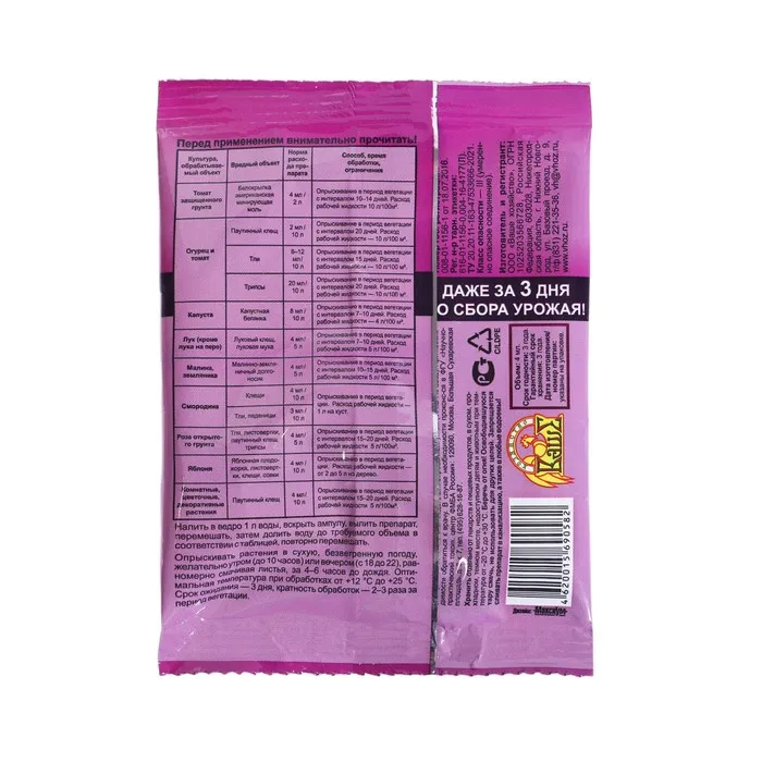«БИОКИЛЛ» не загрязняет окружающую среду, быстро разрушаясь в воде и почве. Срок ожидания от последней обработки до сбора урожая — не более 3-х суток. «БИОКИЛЛ» практически незаменимый препарат для защиты от вредителей смородины, крыжовника, малины, яблони и других плодовых деревьев, томатов, цветов (и в саду, и в комнате), ведь применение многих химических препаратов разрешено только не позднее 20 дней до сбора урожая.