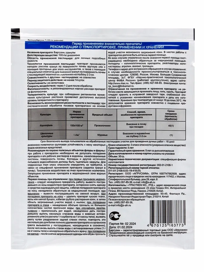 Баргузин — это гранулированный контактно-кишечный инсектицид широкого спектра. Он применяется в борьбе с вредителями–почвенниками: проволочниками, жужелицами, долгоносиками.Механизм действия: Препарат применяется путем внесения в почву гранул при посадке культуры и в период развития вредителей.После внесения в почву, действующее вещество препарата (диазинон) попадает в почвенный раствор, перераспределяется по площади участка и часть препарата проникает в защищаемое растение вместе с почвенной влагой.Попадая в организм вредителя (контактно через кутикулу или кишечно при поедании культуры) воздействует на нервную систему насекомого, в месте действия ингибирует фермент ацетилхолинэстеразу, через 2-3 часа резко снижается поедательная способность вредителей и теряется их двигательная активность.Полная гибель насекомых наступает через 1-3 дня после обработки.Пять преимуществ препарата:Эффективен против широкого спектра почвообитающих насекомых-вредителей, в том числе проходящих промежуточные стадии развития в почве.Незаменимый препарат для борьбы с проволочником и садовыми муравьями.Имеет высокую скорость воздействия (3-4 часа).Баргузин имеет довольно продолжительный период защитного действия (10-14 дней).Препарат имеет удобную в использовании препаративную форму, что позволяет четко дозировать необходимые нормы применения.